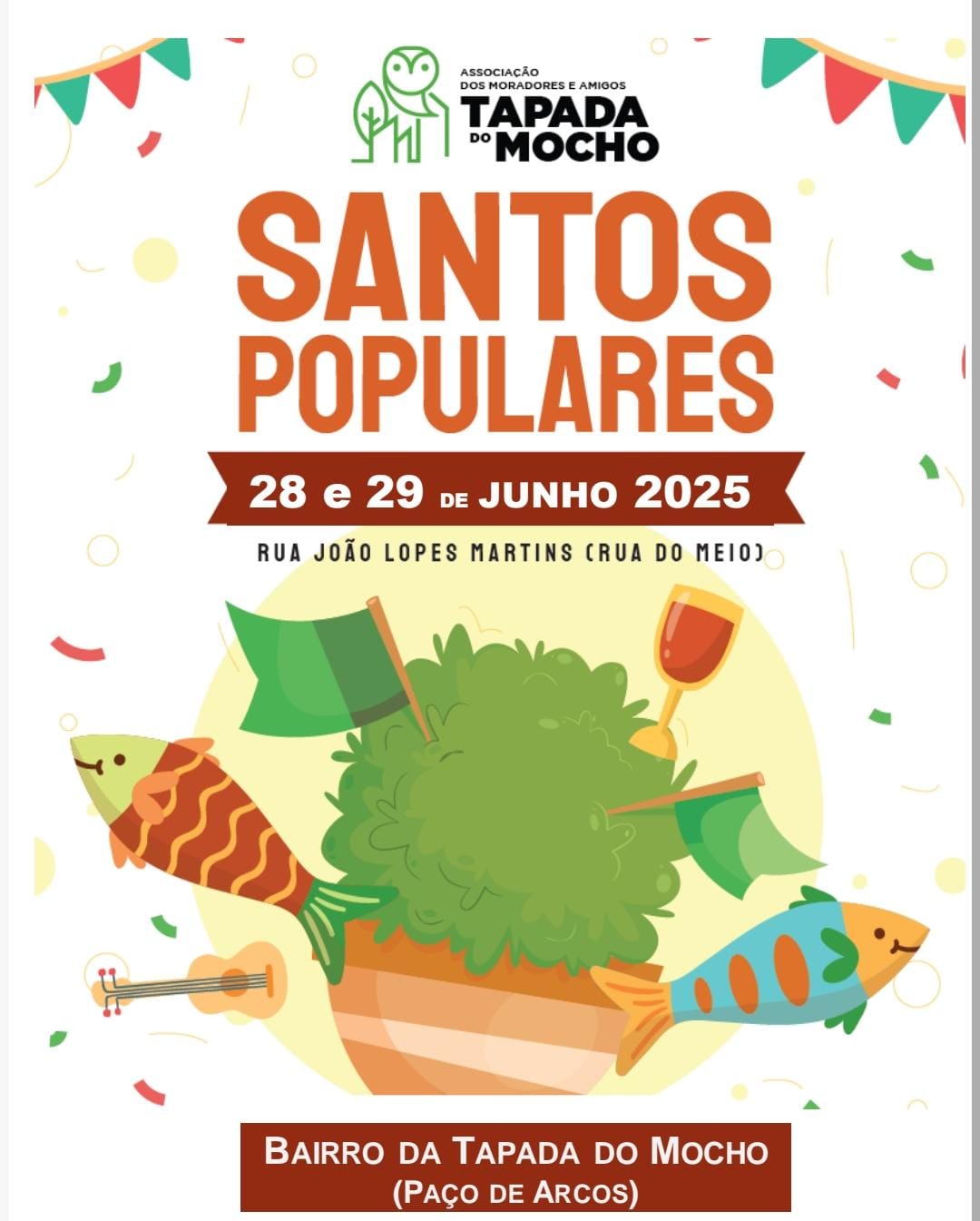 Nos dias 28 e 29 de junho de 2025, a Associação dos Moradores e Amigos da Tapada do Mocho convida toda a comunidade a juntar-se à celebração dos Santos Populares, num arraial cheio de alegria, música, sardinhas e tradição, que terá lugar na Rua João Lopes Martins (Rua do Meio), na Tapada do Mocho, em Paço de Arcos.