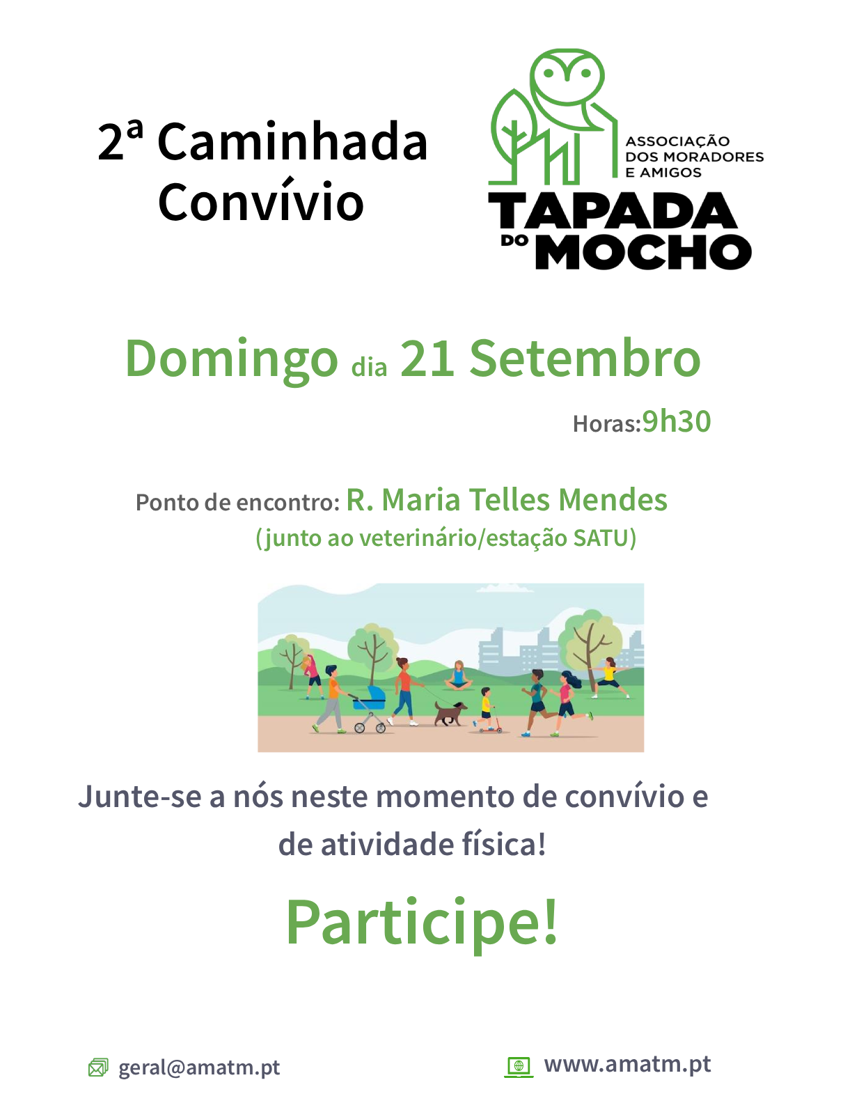 A Associação dos Moradores e Amigos da Tapada do Mocho (AMATM) convida todos a participar na 2ª Caminhada Convívio, um momento de encontro, convívio e promoção de atividade física para toda a comunidade.